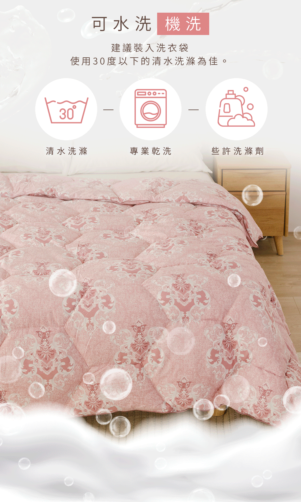 A:建議使用16kg以上洗衣機清洗,請單獨清洗不要與其他衣物或棉被一起清洗,清洗時可用棉被專用的洗衣袋及柔洗模式。