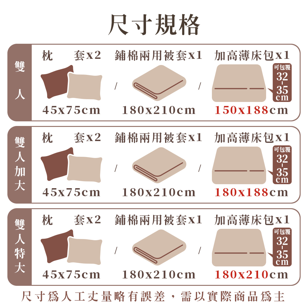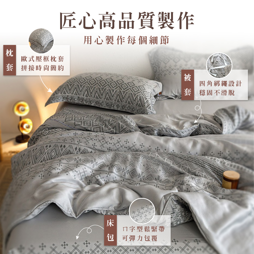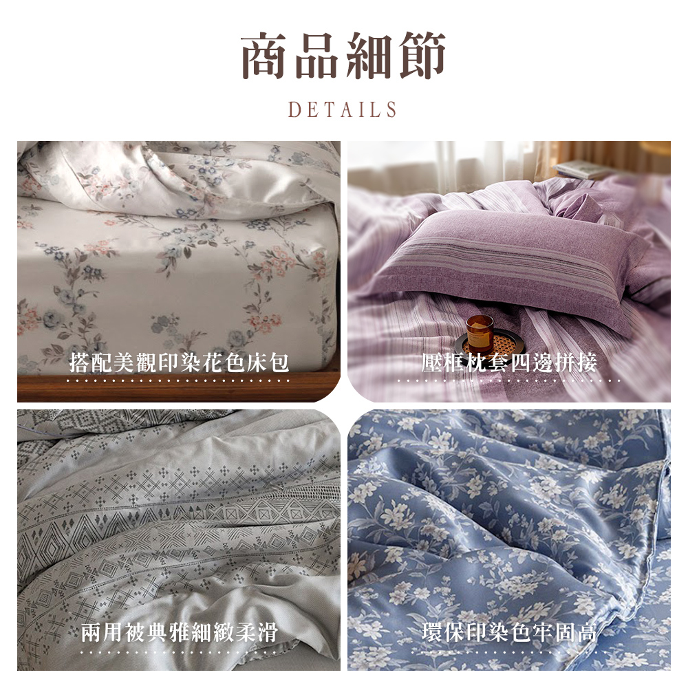 四件組:床包*1/兩用被套*1/壓框枕套*2 (枕套單人規格則為*1)